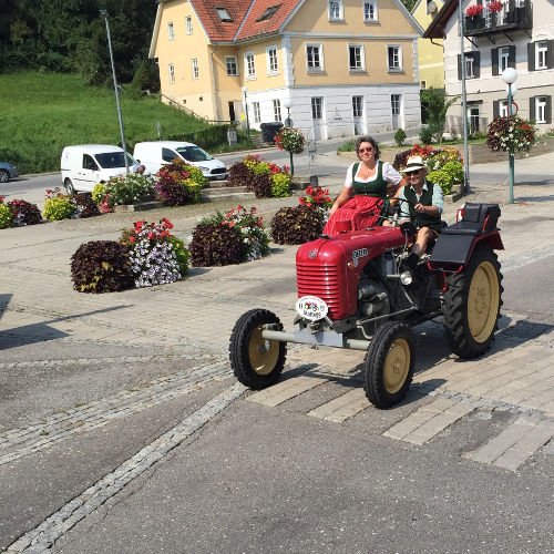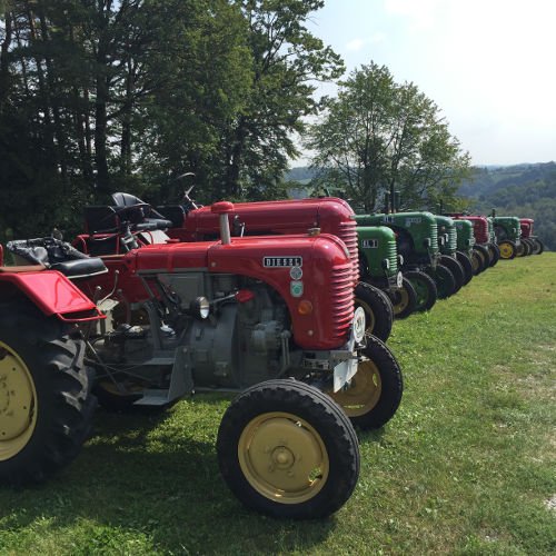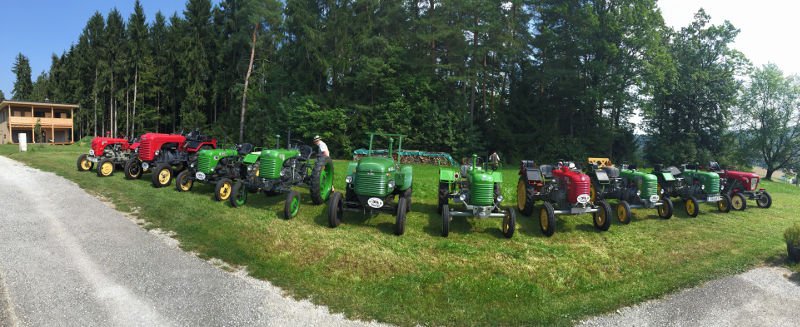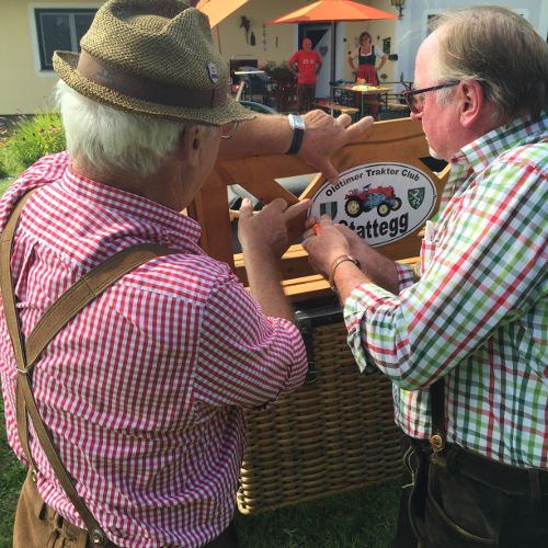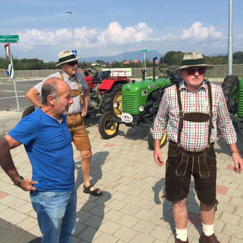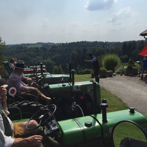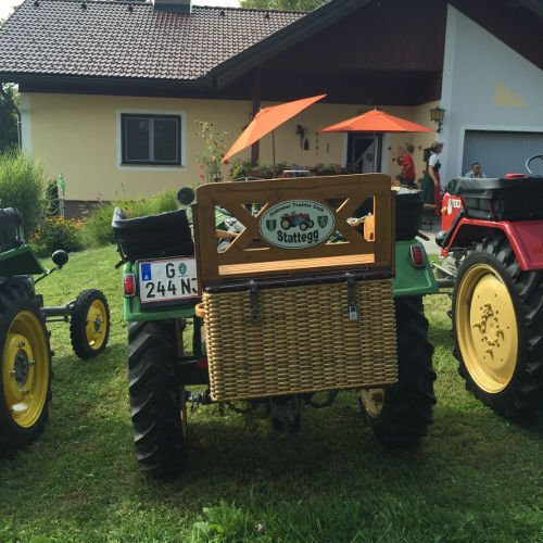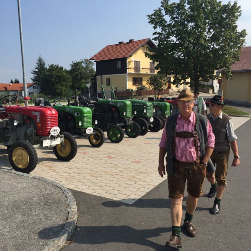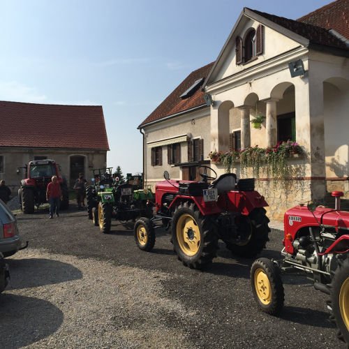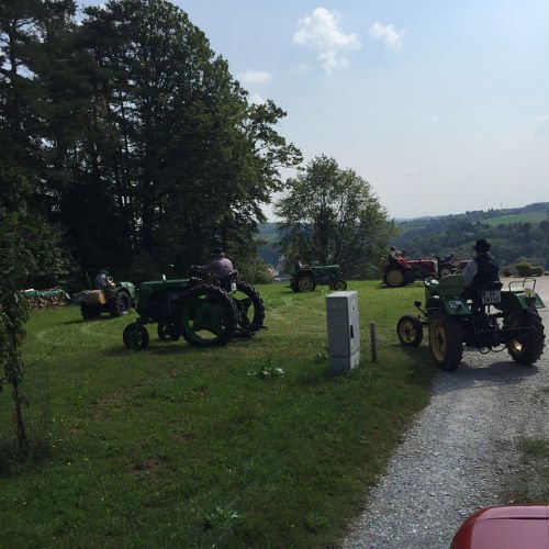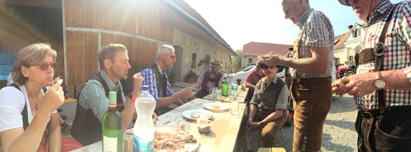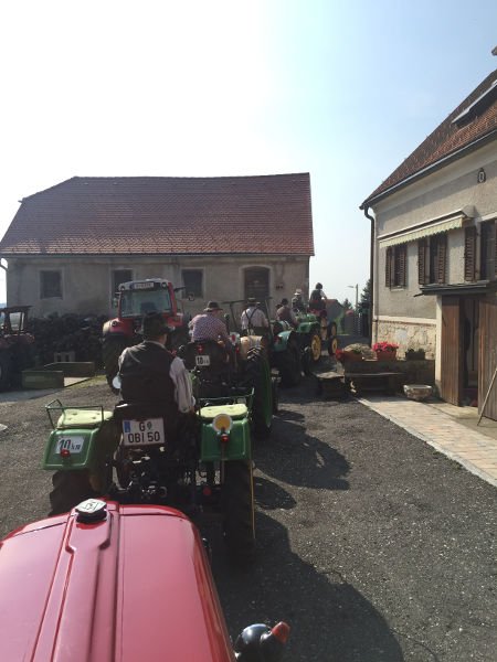 Zuerst eine Stärkung mit köstlichsten Produkten des Bauernhofs der Fam. Gitti und Max Stadtegger in Wenisbuch. Danach wurden wir beim Gemeindeamt von Kainbach von Sepp mit einem Lindner-Oldtimer Traktor empfangen und mit Zwischenstation Kramerwirt nach Nestlbach zum Anwesen der Schwester Maria unseres Franz DAMISCH gelotst.