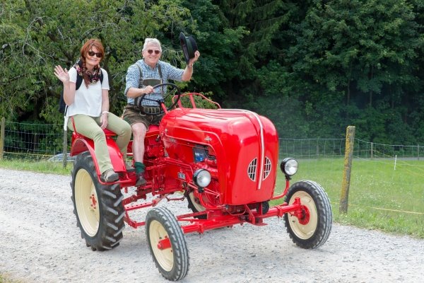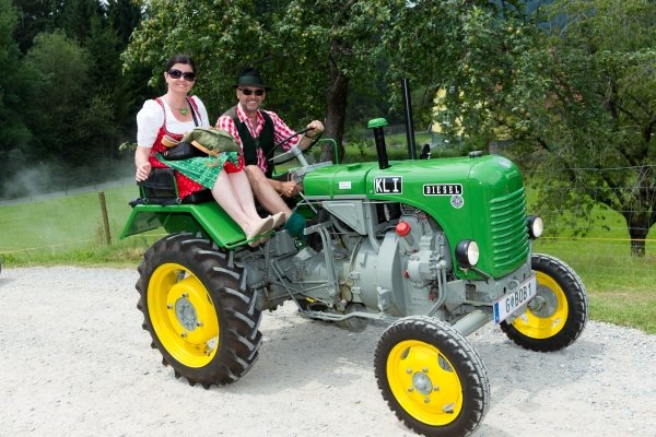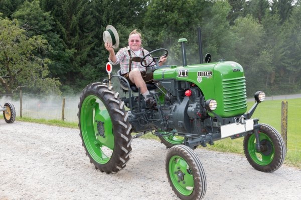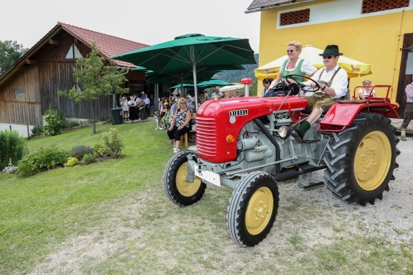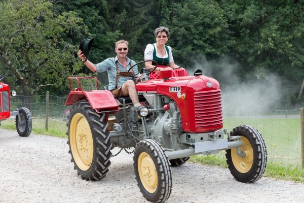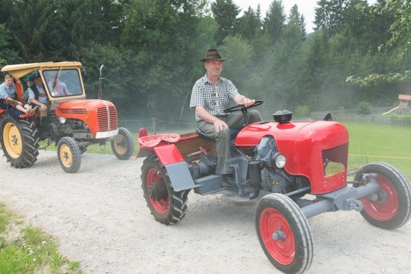 Am 29.6.2014 trafen sich Fritz und Gerti Stehlik, Andreas Schlegl, Fritz und Renate Gangl, Fritz Gratzer in Begleitung von Hilde Zach, Franz Damisch, Günther Dielacher, Ewald Schuster mit Kindern sowie Harry und Michaela Winkler beim Vereinslokal Huberwirt in Stattegg und anschließend gings zum Gruberhof auf die Kalkleitenstraße, Stattegg Buch, wo wir zum Hoffest eingeladen waren. Bestaunt durch die vielen anwesenden Besucher ging es mit unseren Traktoren eine Runde durch den Hof, und schließlich nahmen wir auf der großen unteren Wiese Aufstellung, wo die Festgäste dann Fotos mit den Traktoren schießen konnten.